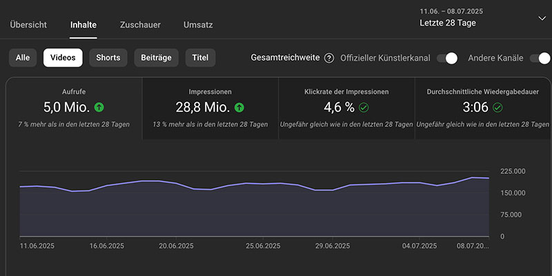 Du bekommst einen klaren Fahrplan: Die 3 wichtigsten Schritte, mit denen du als Musiker auf YouTube sichtbar wirst – mit echten Beispielen, Praxistipps und einer Schritt-für-Schritt-Anleitung. Außerdem erhälst du direkt Einblicke in unsere Analytics und unsere Vorgehensweisen.